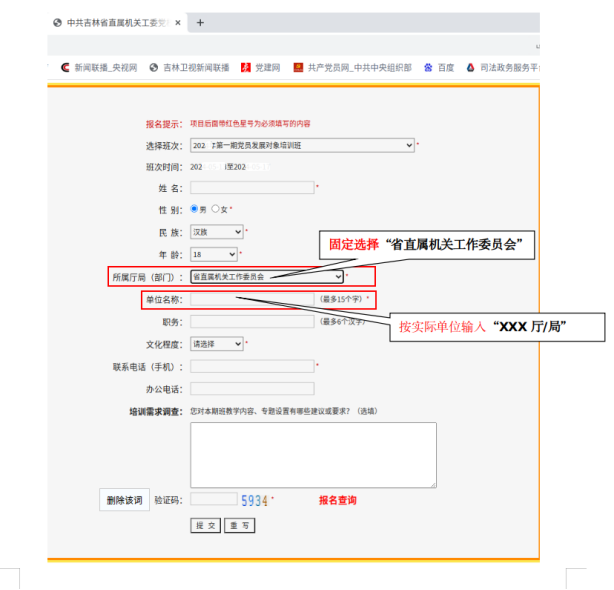 3.报名要求。“所属厅局(部门)”请选择省直属机关工作委员会;“单位名称”一栏请填写所在单位名称(无需填写所在处室名称)。不能重复报名,请核准个人各项信息。